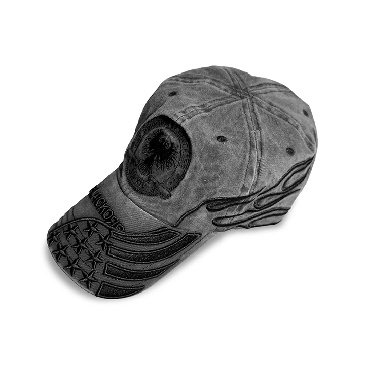 Washed silver-gray cap, wide fit, raised embroidery for structured, edgy look.