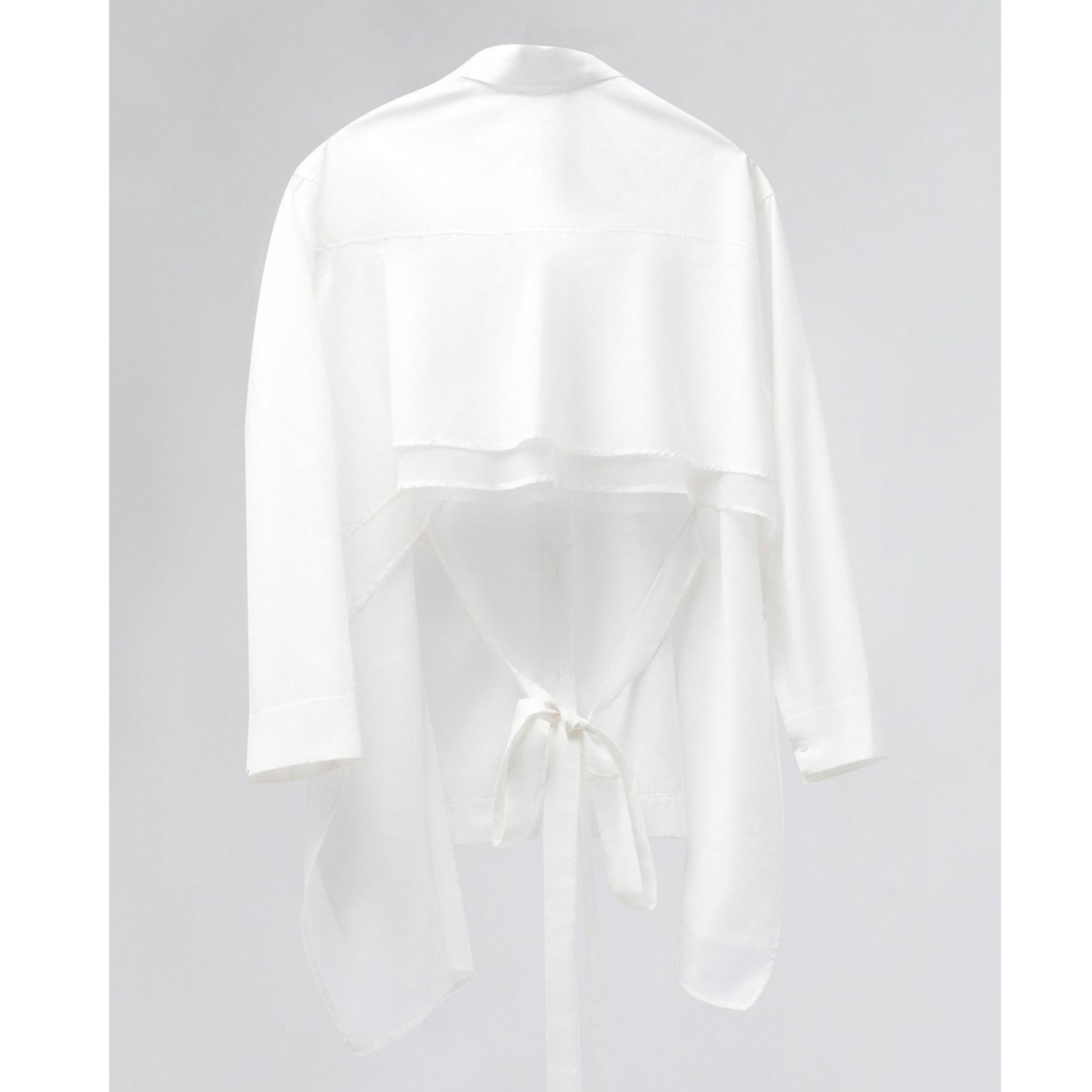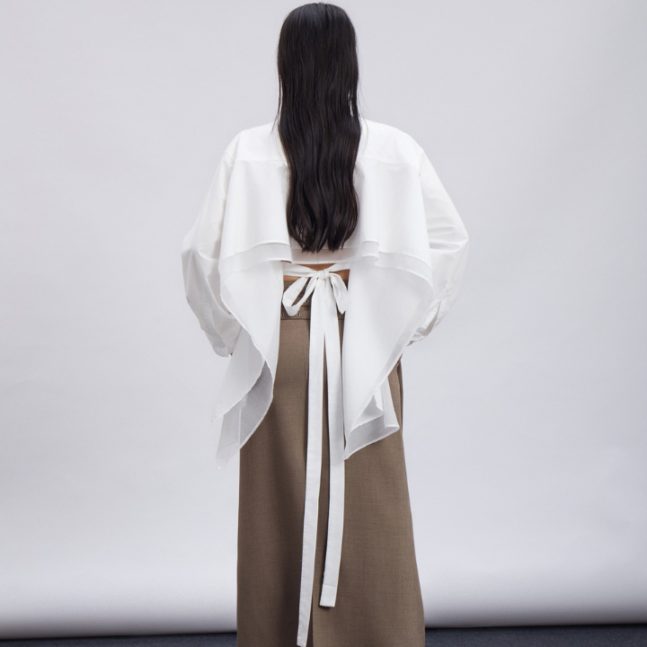 Loose-fit Flirty shirt with straight hem, open back, and layered double tiers. Adjustable back tie adds refinement and a flattering silhouette.