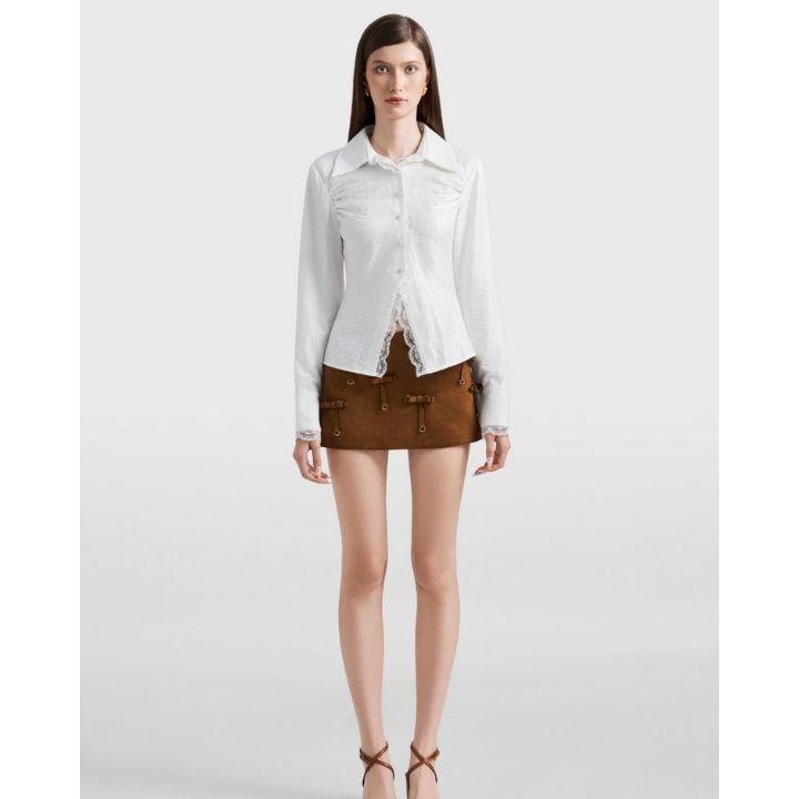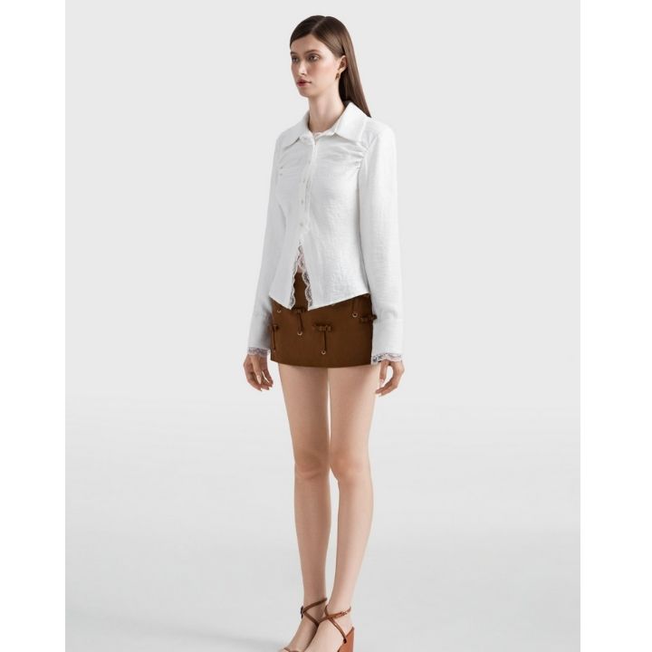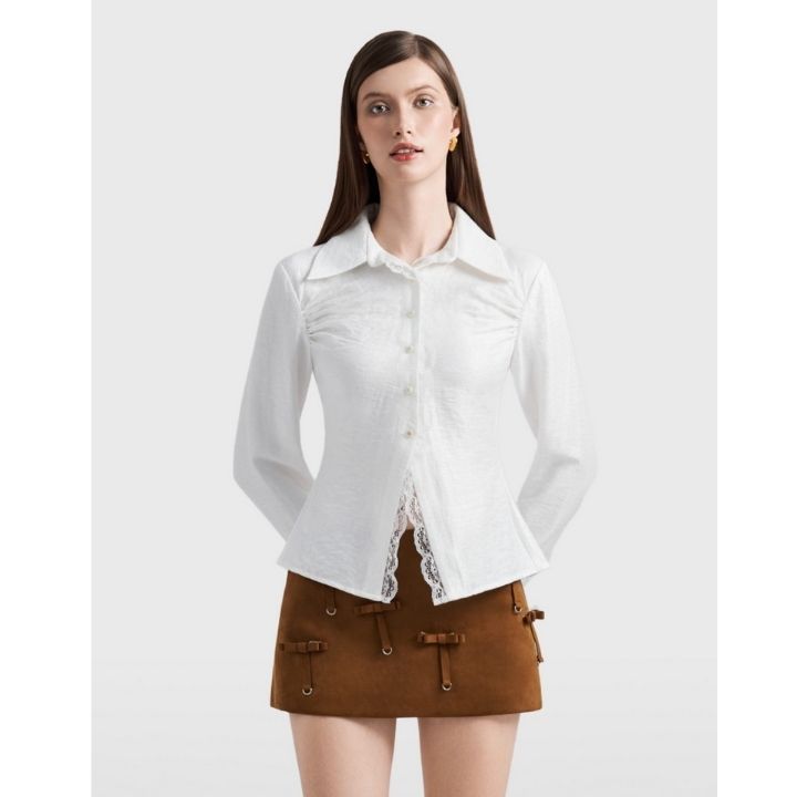 A timeless piece with a romantic twist, this ivory button-up shirt features subtle ruching along the front, delicate lace trimming, and tailored seams that create a flattering silhouette.