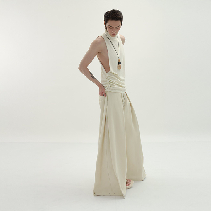 Sleeveless high-neck oversized top in short fur fabric with inner lining, ruched sides