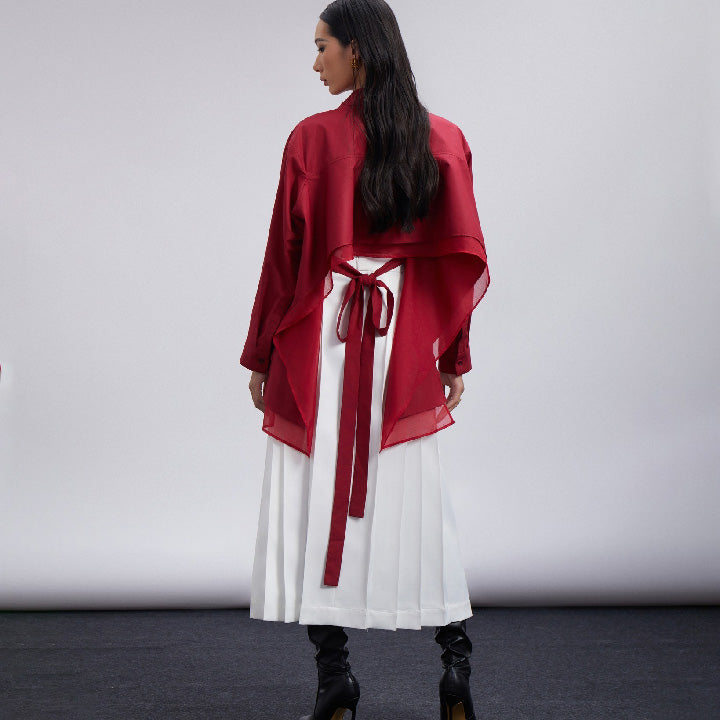 เสื้อเชิ้ตทรงหลวมสไตล์ "Flirty" ชายตรง ด้านหลังเปิด แต่งระบายสองชั้น ผูกโบว์ด้านหลังได้ เพิ่มความหรูหราและทรงสวย